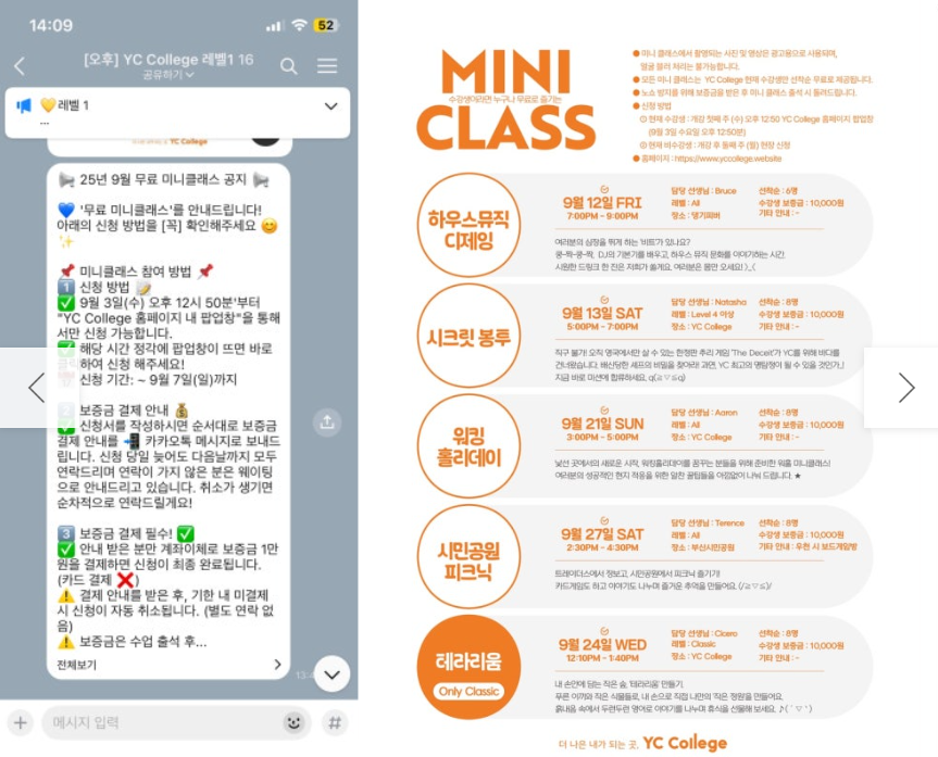 정규 수업 이외에도 토요일 자율 수업, 미니 클래스를